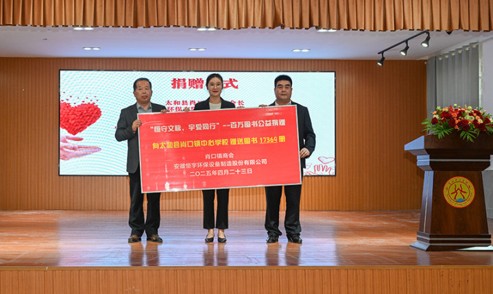 捐赠仪式上,太和县肖口镇商会、安徽恒宇环保设备制造股份有限公司(简称“恒宇环保”)向肖口镇中心学校图书馆捐赠图书17369册。据悉,此次捐赠的图书涵盖环保科普、文学经典、儿童读物等多个领域,总价值逾100万元。